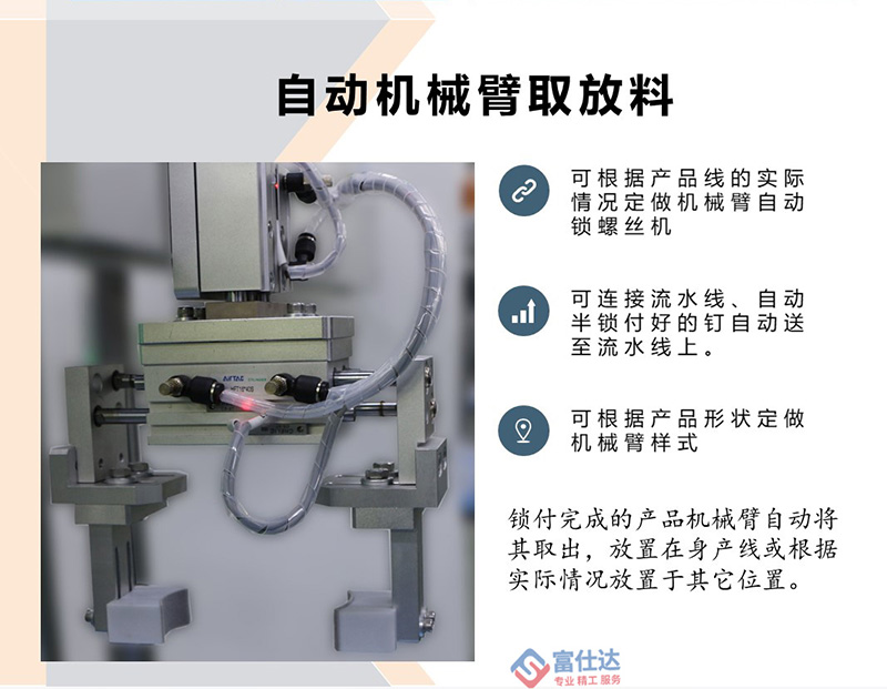 深圳市富仕達(dá)自動(dòng)化設(shè)備有限公司是國(guó)內(nèi)領(lǐng)先的以自動(dòng)鎖螺絲設(shè)備為核心的自動(dòng)化設(shè)備制造商,堅(jiān)持以客戶需求為中心,定制自動(dòng)化鎖螺絲方案,已有超過(guò)4000家企業(yè)采用富仕達(dá)定制的自動(dòng)鎖螺絲設(shè)備實(shí)現(xiàn)“機(jī)器換人”,節(jié)省大量人力成本。