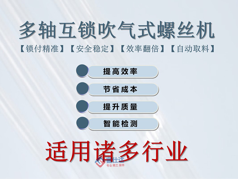 多軸立式自動(dòng)擰螺絲機(jī)主要由自動(dòng)送釘機(jī)、多軸鎖付系統(tǒng)、PLC控制系統(tǒng)等組成,內(nèi)置集成作業(yè)臺(tái),體積小、不占地。通過(guò)治具固定好產(chǎn)品放置的位置,由設(shè)備自動(dòng)完成螺絲輸送及緊固工作,根據(jù)產(chǎn)品特點(diǎn)設(shè)計(jì)鎖付方案,實(shí)現(xiàn)一次擰好所有螺絲,設(shè)備性能穩(wěn)定,效率高,可替代大量人工重復(fù)勞動(dòng),減少企業(yè)成本。