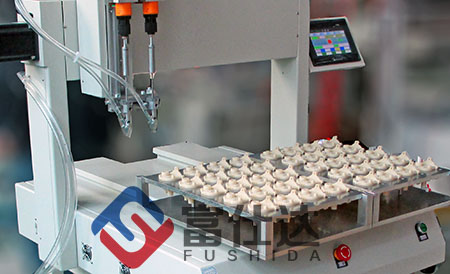 產品有三顆螺絲需要緊固,為了提高生產效率,這里采用富 仕達雙工位,雙平臺坐標式自動鎖螺絲機。